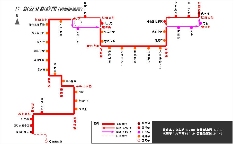 火車(chē)站—遼河大街—東新路—新興大街—學(xué)府路—遼河大街—市委廣場(chǎng)—遼河大街—新華路—富安園北側(cè)道路—?jiǎng)?chuàng)新路—金牛山大街—體育館路—青花大街—清華路—智勝新家園(終點(diǎn)回返)—清華路—青花大街—體育館路—金牛山大街—?jiǎng)?chuàng)新路—富安園北側(cè)道路—新華路—遼河大街—市委廣場(chǎng)—建設(shè)街—學(xué)府路—新興大街—東新路—建設(shè)街—公園路—火車(chē)站。